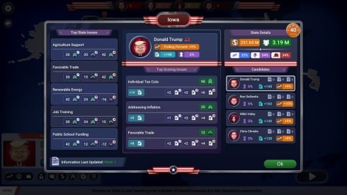 《政治机器 2024》不是普通的政治评论。忘记社交媒体的咆哮 – 这个游戏将您带入政治野兽的心脏。你不仅仅是在选边站队,你还是一个竞选经理,为你通往白宫的道路制定战略。你认为你懂政治吗?在 The Political Machine 2024 中,您可以选择一位真正的候选人或创建自己的局外人。但请保留你的帽子,因为这不是一场人气竞赛。想象一下,一个突然的浑浊广告会破坏对手精心制作的信息,或者一个意想不到的支持来赢得犹豫不决的选民。这是竞选活动的季节!但是等等,还有更多!通往椭圆形办公室的路并不容易。在“政治机器 2024”中,您会找到初选。在进入国家舞台之前,您需要说服您的政党。您必须在党派忠诚度和赢得美国人民的心的最终奖品之间取得平衡。这是一个重复真实政治曲折的模拟器。您做出的每一个决定,从开发平台到管理竞选资金,都可能决定您成为总统的机会。那么,您准备好测试您的政治技能了吗?2024 年的政治机器正等着你。请记住,在残酷的政治世界中,你迈出的每一步都是一场赌博。你能承受压力吗?