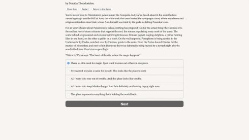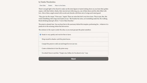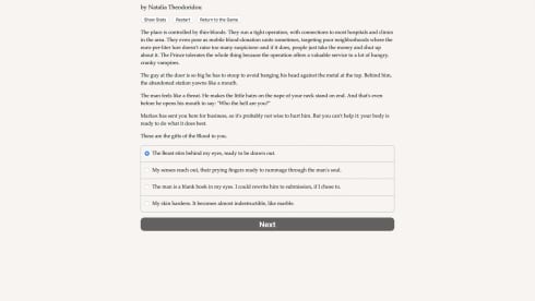 Vampire: The Masquerade – Sins of the Sires 是一部互动小说,用户将以经典角色扮演游戏的风格阅读角色和描述之间的对话,在那里他们将能够做出选择并影响故事的事件和故事情节。故事将在雅典发展,主角将不得不为他的老板偿还债务。Vampire: The Masquerade – Sins of the Sires 中的玩家将不得不:沉浸在吸血鬼冲突的气氛中,选择一方并在通过过程中做出负责任的决定。观看情节,您将能够在黑夜掩护下猎杀人的血腥兄弟的陪伴下取得成功。面对保守的古人假面舞会,它迫使所有吸血鬼躲避了解神秘的贵族,他打算为血族创造一个新世界,夺取统治悲惨社会的权力。决定一个氏族:Tremere、Ventrue、Malkavian、Banu Hakim 或成为弱者血统。此外,用户将为他们的角色选择性别(男性/女性)、面具和性别偏好,为 Camarilla、Anarchs 表演或通过揭露 Peisistratus 王子、Primogens 和 Aristovoros 的腐败来建立自己的道路。
