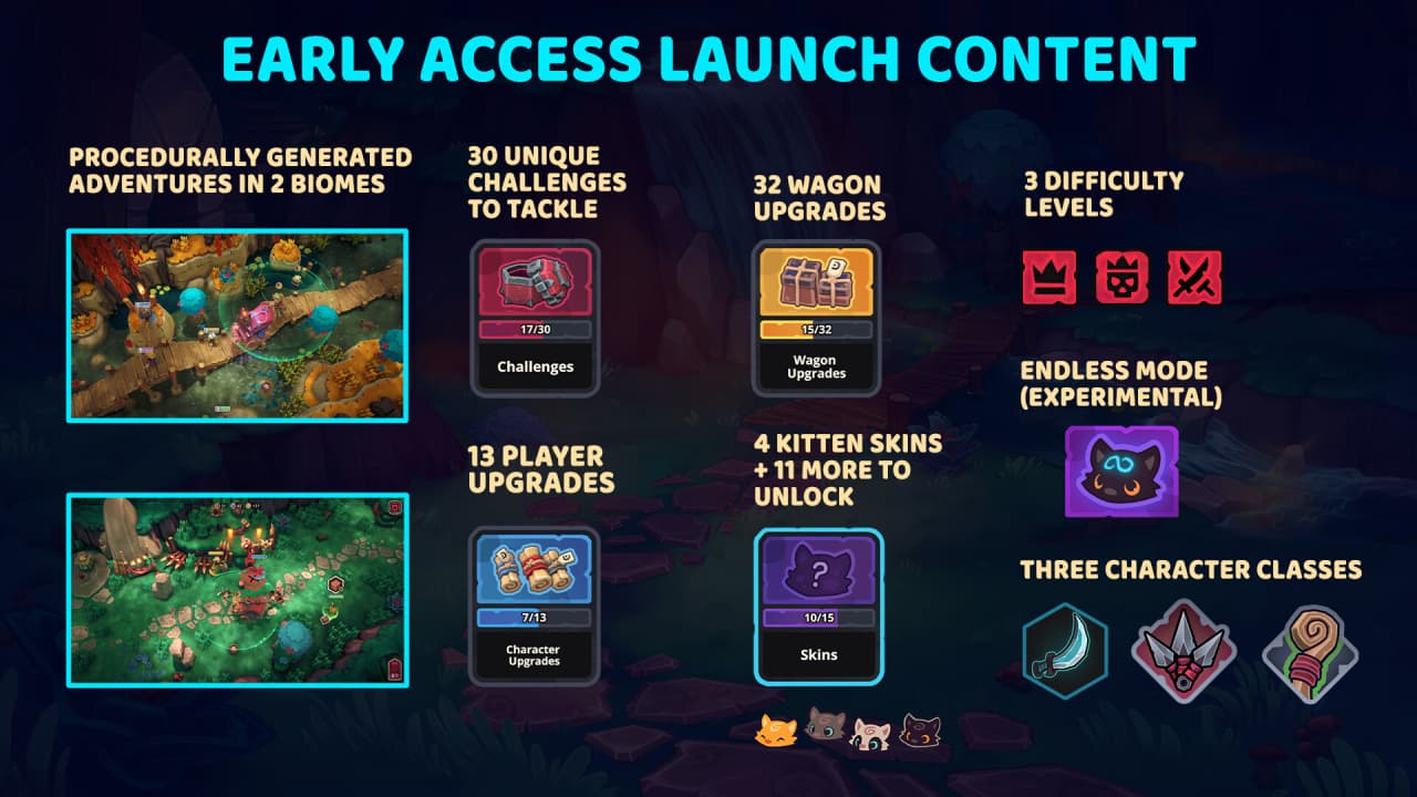 Wild Woods 专为 2-4 名用户的联合通行而设计。但是,您可以自己玩这个独立项目。难度分为两个级别 – 普通和困难。在比赛开始之前,您可以为您的角色选择皮肤。对于同志们,您将需要游戏手柄。Wild Woods 中的控件非常简单。在摇杆的帮助下,进行移动,三个按钮分别负责攻击、滚动和与物体互动。你可以捡东西和扔东西。这是一款合作动作 Roguelike,具有自上而下的视图和一天中的时间变化。白天,猫咪们打破树木和灌木丛,收集各种资源,并在车缓慢移动时将所有东西搬进车里。镜头只跟着她。夜幕降临时,您必须保护运输工具免受獾和兔子的侵害,并保持火炬中的火势燃烧,从而照亮道路。然后一个新的周期开始了。在路标处,团队成员投票决定下一步要走哪条路。有时我会遇到商店。在其中,您可以升级您找到的资源的购物车。此外,一群猫可能会偶然发现倒下的树木。他们必须迅速摧毁,否则坐骑会撞到障碍物。然后部分货物将从运输中掉出。所有野兽和战车都有自己的健康条。