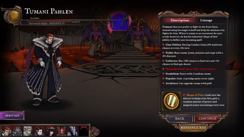 Few Nights More 是一款回合制吸血鬼主题的 roguelike游戏。根据剧情,人类曾经打败了黑暗势力,但他们重生了,想要归还本应属于他们的东西。人们对这一转变感到不满,并将他们的英雄送入了邪恶的巢穴。在这里,他们提出扮演吸血鬼领主。游戏玩法大致可分为 2 个阶段。首先,用户为对手的入侵做准备。在他的据点中,他可以创建和升级房间、设置陷阱和怪物、升级他的仆从、分发能力以及与商人、收债员或合同经销商进行交易。经过所有的准备,一系列的战斗开始了。在管理期间,摄像机位于顶部。在战斗中,它的角度会变为侧视图。这里的战斗是回合制的。如果敌人打败了主角或摧毁了他的坟墓,那么你将不得不重新开始。您可以选择性别、学科(总共有 4 个,每个都有 30 项技能)、8 个氏族中的一个(它们彼此非常不同)和城堡的布局。除了性别之外,所有这些都会影响游戏玩法。还有难度级别的选择。他们总共有 15 个。作为完成它们的奖励,额外的内容被解锁。例如:新城堡、吸血鬼领主、背景故事。在每次运行中,用户都会获得各种增益、物品、技能。这里还有传说中的武器。玩家逐渐获得 legacy 积分。它们是元进展所必需的。