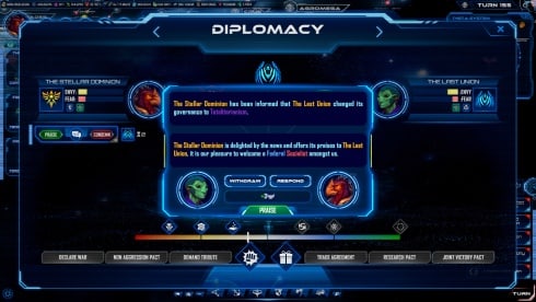 Stellar Sovereigns 可以取悦 4X 类型的粉丝。这款全球太空策略游戏邀请玩家在星团中领导他们的帝国。地图是在每次新的游戏过程中随机创建的。此标题仅包含单人游戏模式,因此您将不得不与机器人战斗。所有游戏都是实时进行的。游戏玩法的重点是微观管理。但与此同时,该视频游戏允许用户将部分权力委托给 4 位由人工智能控制的州长。该产品具有类似于 RPG 的练级系统。完成任务时,用户可以获得积分并改进他们的特征。在游戏 Star Sovereigns 中,您可以在星体领域中提取资源,在方舟中运输先驱者,探索太阳系,参与外交,研究新技术(有 22 棵科技树),发现世界,殖民它们并将它们相互连接,将小殖民地变成繁荣的大都市,创建贸易路线。独立游戏有国外和国内交易。市场影响商品的价格。在定居点,有必要进行宣传,建立税收和关税,通过满足居民的需求来刺激人口增长。在这里建立防御和参与敌对行动也是必要的。这里的战斗是实时的。各种各样的星际飞船舰队参与了其中。用户可以直接控制他们的所有子系统,但如果他们愿意,他们可以启用自动化。每个单元都可以在竞技场中进行定制、升级和测试。除了敌方派系的船只外,还有海盗。