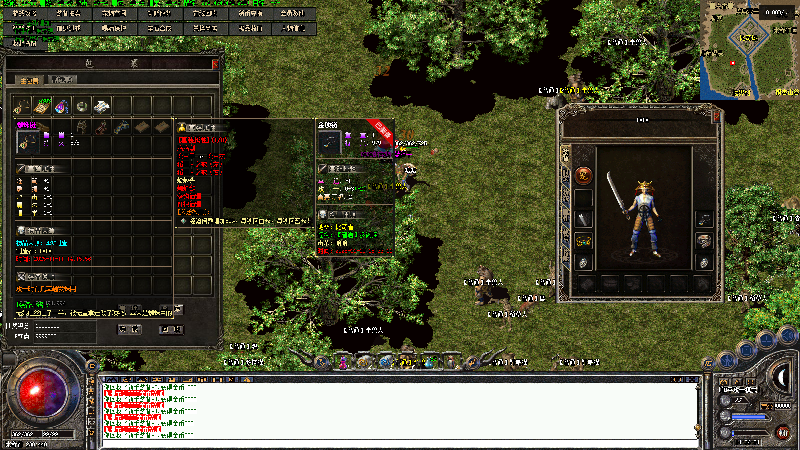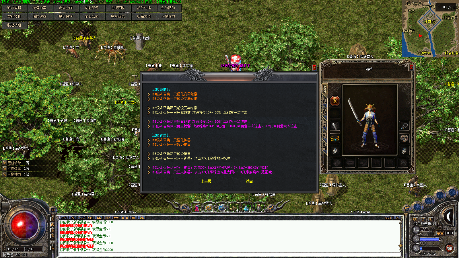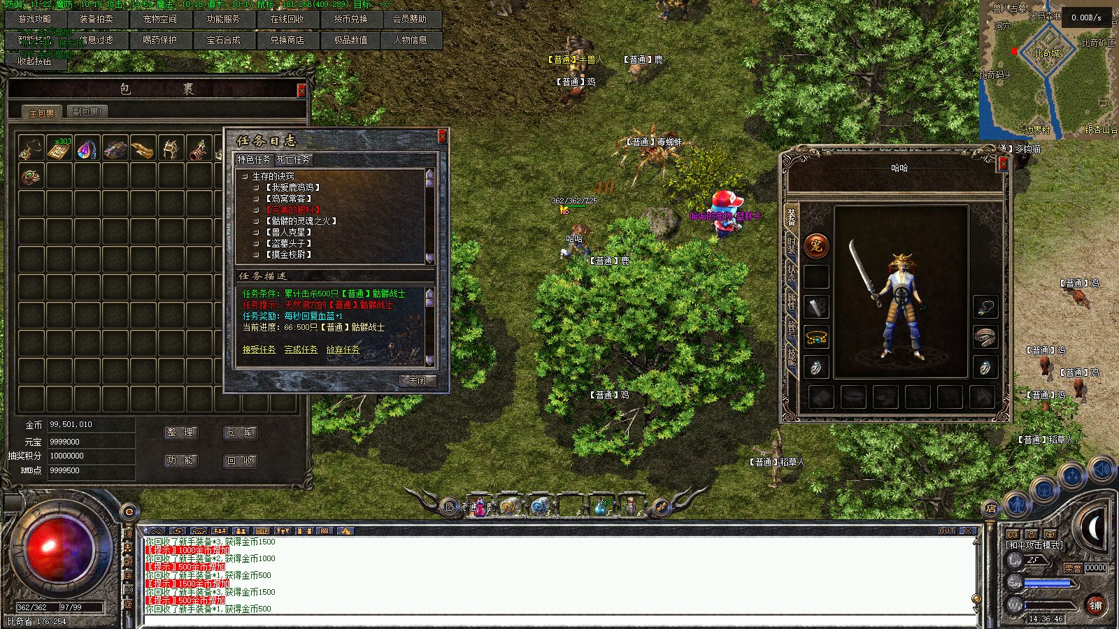 一大陆分有BOSS材料收集,比奇野外特殊装备收集