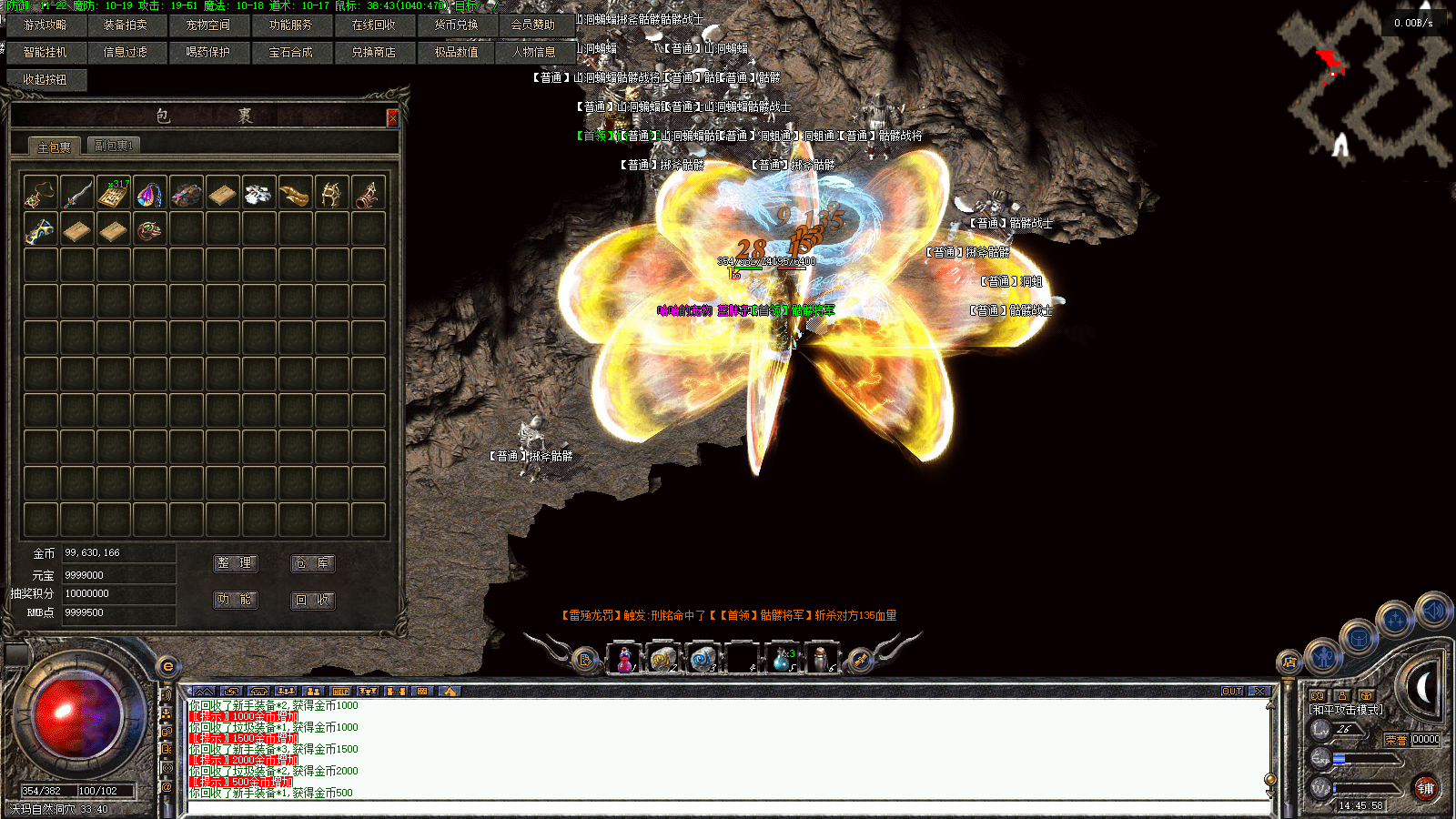 大部分的功能都在左上角,可以每个都点开看看,有智能挂机,宝石合成,自动喝药,兑换商店,功能服务器,在线回收,货币兑换等等